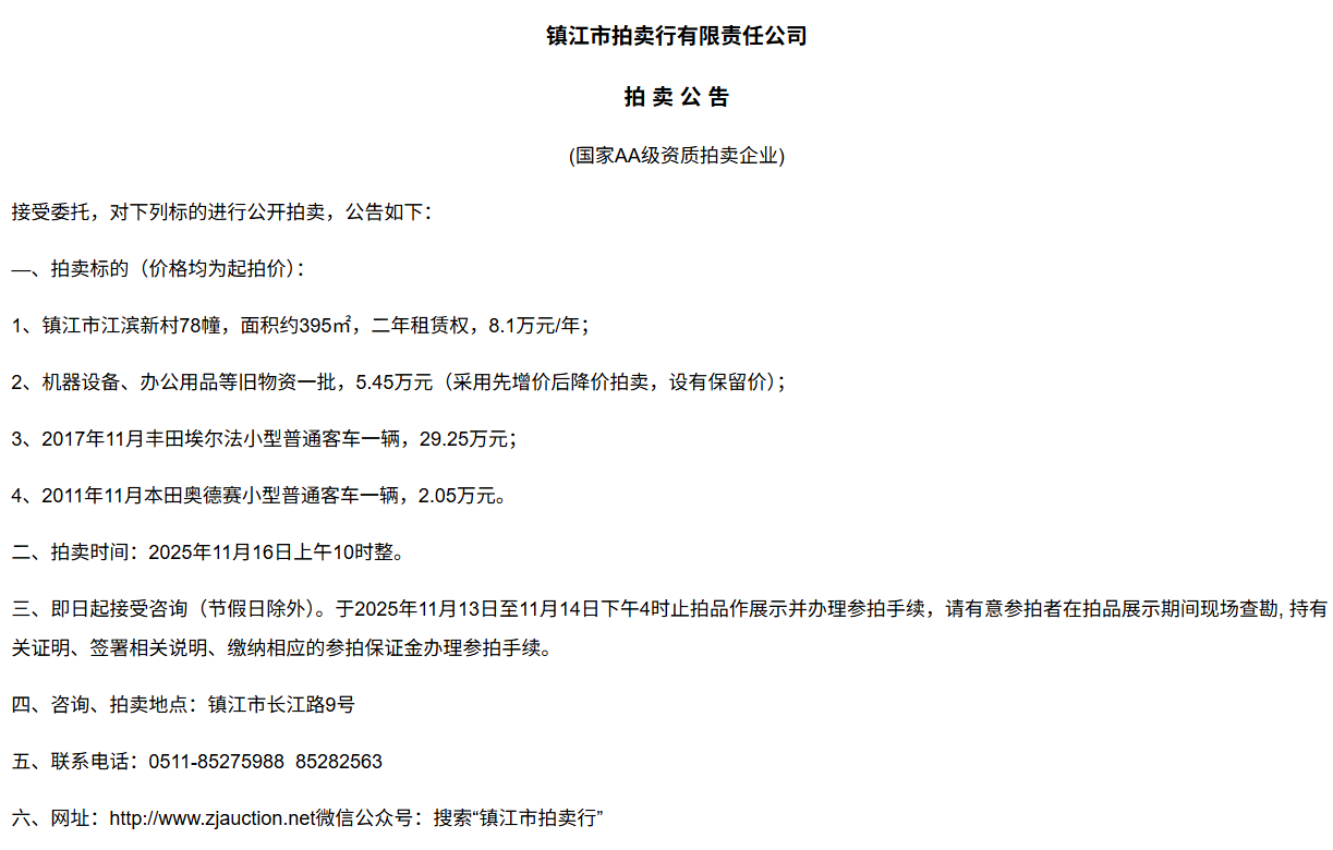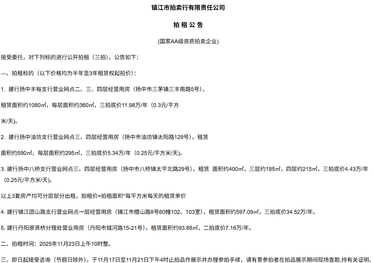 鎮江市拍賣行有限責任公司拍 租 公 吿(國家AA級資質拍賣企業)接受委托,對下列標的進行公開拍租(三拍),公告如下:—、拍租標的(以下價格均為半年至3年租賃權起拍價):1.  建行揚中豐裕支行營業網點二、三、四層經營用房(揚中市三茅鎮三豐南路5號),租賃面積約1080㎡,每層面積約360㎡,三拍底價11.98萬/年(0.3元/平方米/天)。2.  建行揚中油坊支行營業網點三、四層經營用房(揚中市油坊鎮太陽路129號),租賃面積約590㎡,每層面積約295㎡,三拍底價5.34萬/年(0.25元/平方米/天)。3. 建行揚中八橋支行營業網點三、四層經營用房(揚中市八橋鎮太平北路29號),租賃  面積約400㎡,三層約185㎡,四層約215㎡,三拍底價4.43萬/年(0.25元/平方米/天)。以上3套房產均可分層部分出租,拍租價=拍租面積*每平方米每天的租賃單價4. 建行鎮江團山路支行營業網點一層經營用房(鎮江市檀山路8號60幢102、103室),租賃面積約597.09㎡,三拍底價34.52萬/年。5. 建行丹陽原賢橋分理處營業用房(丹陽市城河路15-21號),租賃面積約93.88㎡,二拍底價7.16萬/年。二、拍租時間:2025年11月23日上午10時整。三、即日起接受咨詢(節假日除外)。于11月17日至11月21日下午4時止拍品作展示并辦理參拍手續,請有意參拍者在拍品展示期間現場查勘,持有關證明、簽署相關說明、繳納相應的參拍保證金辦理參拍手續。四、咨詢、拍租地點:鎮江市長江路9號五、聯系方式:0511-85275988   13655299933楊先生六、網址:http://www_zjauction_net.xueyanqiang.cn;微信公眾號:搜索“鎮江市拍賣行” 拍品清單2025.11.23序號名稱起拍價(元)標的說明1建行揚中豐裕支行營業網點二、三、四層經營用房(揚中市三茅鎮三豐南路5號),租賃面積約1080㎡,每層面積約360㎡三拍底價11.98萬/年(0.3元/平方米/天)1、1-3號房產均可分層部分出租,拍租價=拍租面積*每平方米每天的租賃單價;2、意向競拍人在拍賣前需持營業執照或身份證與委托方說明租賃房產經營業態,確定意向后出具房產承租用途承諾書,經委托方審核后,方可交納保證金參加競拍;3、租賃期限為半年至3年(承租方與出租方協商而定),承租方每半年或一年結付租金,租賃期間的水、電費用及其它相關費用均由承租方承擔;4、承租方不得用于經營和保管危險物品,不得用于開設餐飲、娛樂等可能嚴重影響消防安全、運營安全的經營業態,不得用于經營委托貸款、小額貸款等可能冒用委托方名義,帶來聲譽風險的經營業態。租賃期內,承租方不得破壞墻體結構,自行成就消防、安全等使用條件,不得擅自將租賃房屋轉租、轉讓給他人使用,否則委托方有權收回房屋;5、拍租成交后,承租方將租金交至出租方指定賬戶,傭金交至拍賣方賬戶(拍租傭金為該房屋一個月租金)。承租方憑租賃合同無息退還保證金。2建行揚中油坊支行營業網點三、四層經營用房(揚中市油坊鎮太陽路129號),租賃面積約590㎡,每層面積約295㎡三拍底價5.34萬/年(0.25元/平方米/天)3建行揚中八橋支行營業網點三、四層經營用房(揚中市八橋鎮太平北路29號),租賃面積約490㎡,每層面積約245㎡三拍底價4.43萬/年(0.25元/平方米/天)4建行鎮江團山路支行營業網點一層經營用房(鎮江市檀山路8號60幢102、103室),建筑面積約597.09㎡三拍底價34.52萬/年5建行丹陽原賢橋分理處營業用房(丹陽市城河路15-21號),建筑面積約93.88㎡二拍底價7.16萬/年
